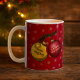 Spread some Christmas cheer with this festive mug, featuring a cartoon of two tree decorations or baubles on an Xmas tree branch, one shiny gold, the other glittering red. Use "Personalize this template" to change the "Merry Christmas! & A Happy New Year!" text if desired.