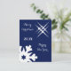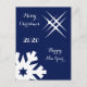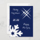 White silhouette images of a partially viewed snowflake in the bottom left, and a shining group of stars in the top right area of the card. Texts Merry Christmas, 2020 and Happy New Year go from top left to bottom right. Customizable text Merry Christmas and Happy New Year to You and Yours! Wish you all the Happiness and Prosperity in the Universe. With Love, Mary on the back of the card. Dark blue or navy background on the front, white background on the back. Customizable one-of-a-kind postcard. You can change all the images and you can change or delete any text. Merry Christmas and Happy New Year!