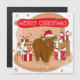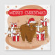 Cute Cartoon ox high land cow is standing on the ground on pink and brown background with new year gifts and Merry Christmas text