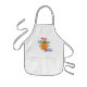 Kids apron shown in white with a colourful gingerbread house print. Perfect for you holiday baking delights. Text of "merry Christmas baker" in red, green and purple over white background.