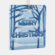 Soft snow falls on a blue lit woodland scene with a bold Merry Christmas message.
