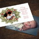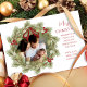 This design features Merry Christmas with merry Christmas holiday wreath with a modern photo family 2 two picture layout, simple elegant family minimalist, rustic green typography script red, a trendy botanical pine nature leaves, stylish trendy brush script font, simple watercolor greenery branches, Christmas holiday red holly berries, green winter foliage holly berry, Christmas holiday photo birth announcement cards