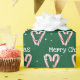 Merry Christmas candy cane hearts with snowflakes on green background.