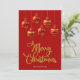 Merry Christmas in a fancy decorative script font in golden colour with red and gold tones hanging Christmas baubles design. This red background colour Christmas card is designed so you can change the colour of the background and also enter your family name or remove it if you wish to just have the design without the text.