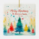 "Merry Christmas" colourful pine trees ornament bears a joyful design that is a whimsical watercolor scene of outdoor pine trees and falling snow in a fanciful watercolor picture. All the text can be edited. Be sure to change the example family name and date to those you want.
