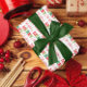 Christmas-themed wrapping paper design featuring Merry Christmas festive retro typography seamless pattern with a white background.