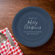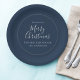 This design features a Merry Christmas holiday modern simple elegant paper plate, traditional winter minimalist navy blue, chic minimal calligraphy script font, modern hand-lettering script font, classic family name contemporary, whimsical typography template, with elegant flourish vintage pattern, with Merry Christmas, a holiday Christmas party dinner dessert paper plate