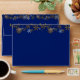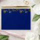 Christmas card envelope in dark blue with gold snowflakes design. The flakes fall from the front top and flap and the design carries over to under the flap. A line of gold text across the flap is easy to customize. The sample wording is, “We wish you a Merry Christmas”. Use to send Christmas cards or holiday party invitations.