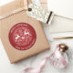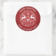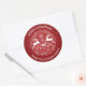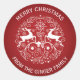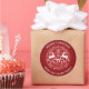 Classic round red and white Christmas sticker. Whimsical design of a pair of deer, swirls and snowflakes against a rich red background.