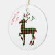 This Christmas ceramic ornament is shown here in white with text of Merry Christmas and print of a plaid deer. Text of Merry Christmas curved on one side of the top along with this year's date of 2025.