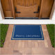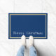 Door mat shown with a deep blue background, white and gold-coloured borders surrounding the doormat and phrase of "Merry Christmas" in a upbeat text in white near bottom of doormat.