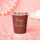 These simple and stylish holiday paper cups say "Merry Christmas" in modern, casual faux gold script typography on a festive red background.