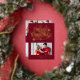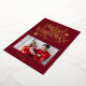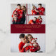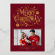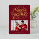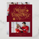 Send a truly dazzling and joyful greeting this season with this vibrant holiday card design. The rich cranberry red background features a striking, stylized "Merry Christmas" script surrounded by festive bursts and stars, all shimmering in brilliant gold foil. Your favorite family photo is elegantly framed on the lower front, while the back offers space for additional images and a heartfelt custom message, making this a luxurious and classic announcement.