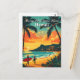A festive postcard featuring a tropical Hawaii Christmas with surfers in Santa hats, palm trees, and a golden sunset beach scene. A fun and unique holiday greeting card.