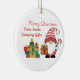 Merry Christmas from Santa bringing gifts with a candy cane and gift and a pile of gifts for everyone on a ceramic ornament.