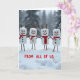 The different textures of the marshmallows, twigs, and scarves bring depth to the composition. The mix of red tones in the scarves adds a unique touch to each character. In the front, the words "FROM ALL OF US." in bold red letters bring a personal touch to the scene, making it a heartfelt holiday greeting from a group. This card is perfect for spreading holiday cheer and goodwill. 🎅🏼🎄🎁