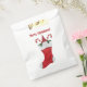 This party favour bag has a red and white stocking with a little gnome with a dark red pointy hat in the top of between two candy canes and clusters of holy leaves with red berries. The text Merry Christmas is at the top in red.