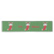 This table runner is dark green with tiny gold flecks and red and white Christmas stockings that have a gnome wearing a red hat with two candy canes and green holly leaves at the top. The text Merry Christmas is in red.