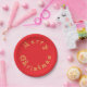 "Merry Christmas" "Fabric Font" in gold, wrapped around the outer edge in a circle, on bright red paper plates