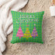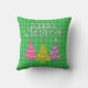 On a green and lime green chequered pattern background, this modern and whimsical pillow design has pink, purple, and green Christmas trees with white text that reads "Merry Christmas."