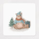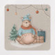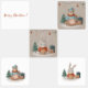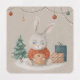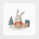Merry Christmas and happy new year greeting card with cute bunny on a cozy carpet with presents and holiday tree