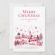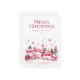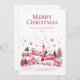 Merry Christmas Greeting Card with an illustration of a pink and red city with snow.