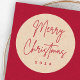 Merry Christmas stickers with red text "Merry Christmas" in a handwritten style script font on a printed Kraft paper look background with the year or custom text below.