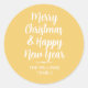 A modern, burnt orange Merry Christmas Happy New Year sticker or envelope seal with white elegant script calligraphy and simple stylish typography on a pumpkin yellow background. Exclusively designed for you by Happy Dolphin Studio!