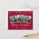 A very festive red Merry Christmas greeting postcard with white falling snow and 3 personal pictures in bright golden frames. Create this fun red photo collage card with 3 of your own photos in the front. Original Christmas design by Luckz.