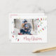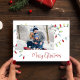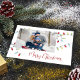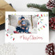 This design features Christmas holiday cute string lights, merry Christmas simple family photo, classic colorful festive red typography,1 one picture stylish trendy, modern elegant simple trendy, minimalist tree decoration trimming, modern calligraphy script font, whimsical Christmas string of lights, artwork by laura Lacina, a fun Christmas holiday budget postcard.