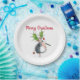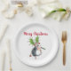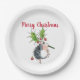 Cute holiday season paper plates feature whimsical watercolor illustration of marching hedgehog with branch of holly and customizable "Merry Christmas" text