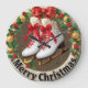 This charming round clock features a pair of white figure skates with red laces and bows, set against a cozy, burlap-textured background. The clock face is surrounded by a festive wreath of holly, berries, and gold baubles, tied at the top with a large red plaid bow. The text "Merry Christmas" runs along the bottom, making it a perfect decorative timepiece for the holiday season.