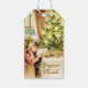 Gift Tags with vintage Christmas graphics from Hungary , 1902. Light colours and festive scene with two little children reading a letter while they are standing next to the candle lit Christmas tree.It is snowing outside. This version comes with the French Christmas wish " Joyeux Noel " .