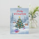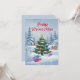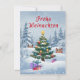 Christmas card with a festively decorated fir tree in the snowy forest. Cute animals gather around the tree, surrounded by gifts and twinkling lights. The loving, fairytale-like design is perfect for children and adults alike.