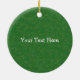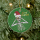 This hanging ceramic ornament has a laughing skeleton holding two sparkling ornaments up to his eyes and is wearing a red fur trimmed Santa hat on a green background with tiny faux gold glitter and the text Merry Christmas. Customize your text on the back with the template.