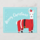 A Merry Christmas postcard with a cartoon llama in a Santa suit and hat on a blue background.