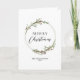 Christmas greeting folded card featuring a minimalist watercolor wreath with red floral and green foliage accents. This elegant wreath frames the greeting "Merry Christmas". Easy to personalize with your family name, year, and greeting on the inside of the card.