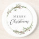 Stone coaster featuring a minimalist watercolor wreath with red floral and green foliage accents. This elegant wreath frames the greeting "Merry Christmas". Makes a great gift.