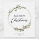 A Christmas wine label featuring a minimalist watercolor wreath with red floral and green foliage accents. This elegant wreath frames the greeting "Merry Christmas". Easy to personalize with your family name.