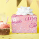 Personalize names and Merry Christmas, or message, in fuchsia script text on peach background with glitter and snowflakes; perfect for wrapping that special gift. Click “Edit Design” to change colours and type styles.