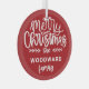 Celebrate the season with this festive family ornament featuring Merry Christmas in white script, personalized with your family name on a bold red background. Styled with a rustic faux wood-slice edge, it brings cozy warmth and cheerful color to farmhouse, modern, or classic Christmas tree décor. A thoughtful gift or keepsake for families of all kinds.