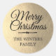 A simple and modern gold Merry Christmas gift sticker or envelope seal you can personalize with your family name or names. The text "Merry Christmas" in black is set in chic handwritten script calligraphy on a champagne gold background. Exclusively designed for you by Happy Dolphin Studio. If you need any help or matching products, please contact us at happydolphinstudio@outlook.com.