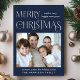 Modern blue holiday photo greeting card featuring "Merry Christmas" in stylish vintage white typography, "happy new year" and a seasonal greeting in elegant white typography, your photo and your name.