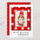 Merry Christmas Photo Simple Red Holiday Frame Christmas Cards features your favourite photo inside a red frame with white polka dots on a white background. The text reads "We wish you a merry Christmas" in modern black script. Personalized with your name and year by editing the text in the text box provided. Designed by ©Evco Studio www.zazzle.com/store/evcostudio