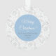 This classic ornament is perfect as a gift or keepsake. The simple design features your photo on the front uploaded into the centre of a grey holiday wreath. The back has a simple leaf pattern in blue and grey with white text reading Merry Christmas, with a place for your names and the year.
