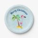 Party plate with the text: Merry Christmas. A whimsical drawing of a pink flamingo wearing a red santa hat. Standing on a mound of yellow beach sand with a green and brown coconut palm tree in the back. Light blue background with a faint polygonal pattern. Cute and fun festive tropical design.