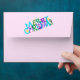 This envelope is light pink with the text Merry Christmas is colourful festive letters on back flap and a dark pink and shiny silver Christmas tree on white star rug beside a black cat with pink bow on the front. Customise your return address on the front with the template.