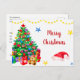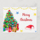 This Christmas tree theme Merry Christmas postcard featuring Christmas tree with gifts and "Merry Christmas" words on the front.
