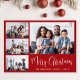 Modern red holiday flat card featuring a 4 photo collage on the front, "Merry Christmas" in a chic white script and your name and year in simple white typography. Add 2 additional photos on the back and your personalized greeting to family and friends.