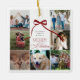 Elegant typography script Merry Christmas 7 photo collage and family name personalized keepsake tree ornament featuring a modern chic red bow.